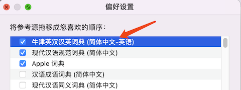 - 打开「词典.app」的偏好设置,将英汉汉英词典勾选并拖到第一位;