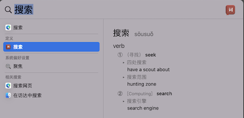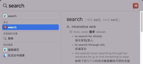 Mac 下的 Spotlight(即「聚焦」)可以很方便地启动应用、搜索文件等,我常用的还有一个功能就是当作英汉汉英词典使用。